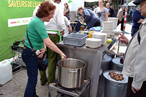 Mit dieser Aktion wollten die GRÜNEN auf Lebensmittelverschwendung aufmerksam machen. Mit Zutaten, die eigentlich für die Tonne bestimmt waren, zauberte Rebecca Harms, Spitzenkandidatin der Europa GRÜNEN, mit Hilfe eines belgischen Spitzenkochs ein köstliches Gericht. Nebenbei wurde natürlich über europäische Themen berichtet.